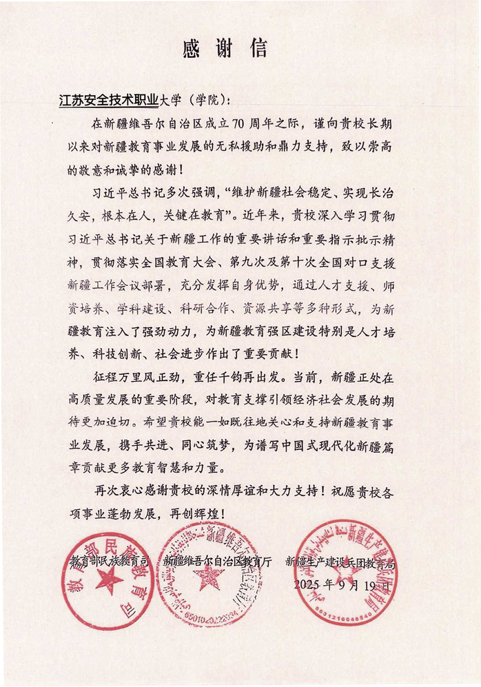我校收到教育部民族教育司、新疆维吾尔自治区教育厅、新疆生产建设兵团教育局的感谢信