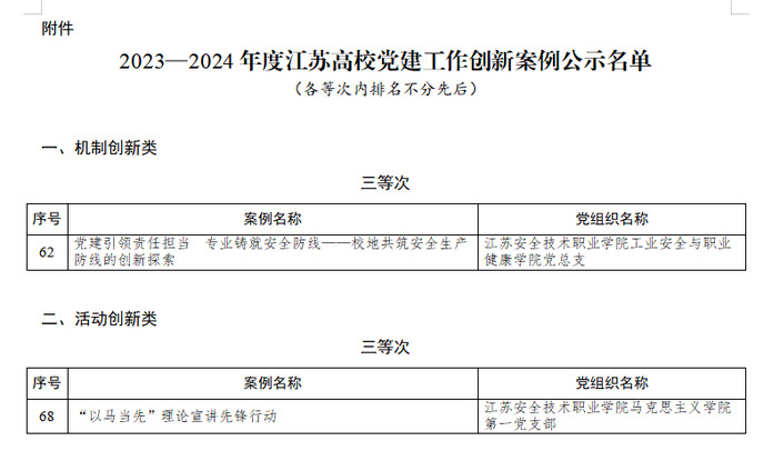 近日,在省委教育工委2023—2024年度江苏高校党建工作创新案例评选中,我校2项案例获奖。其中,《党建引领责任担当 专业铸就安全防线——校地共筑安全生产防线的创新探索》荣获机制创新类三等次,《“以马当先”理论宣讲先锋行动》荣获活动创新类三等次。