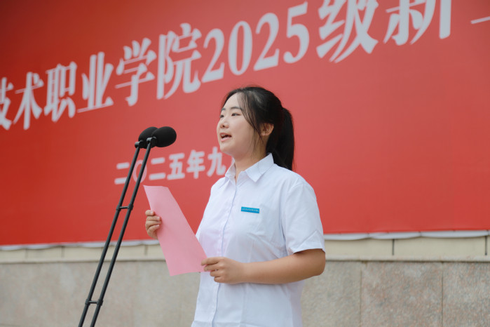 主席台领导为新生代表发放校牌,台下全体新生同步佩戴校牌,标志着2025级新生将承载“修德砺志 博学立新”校训,扬帆起航,笃行逐梦。