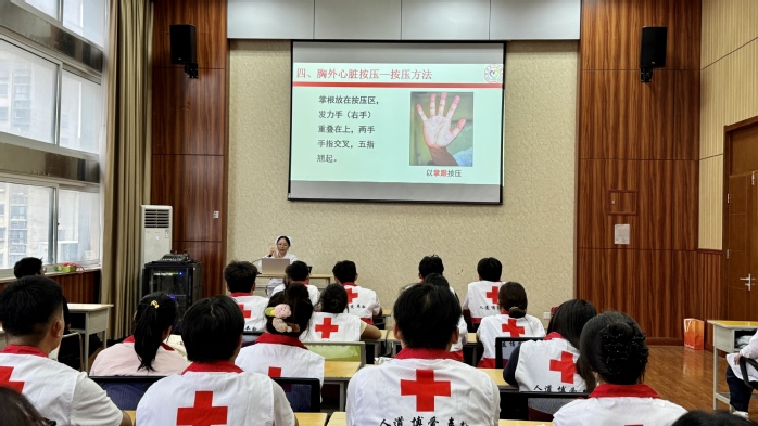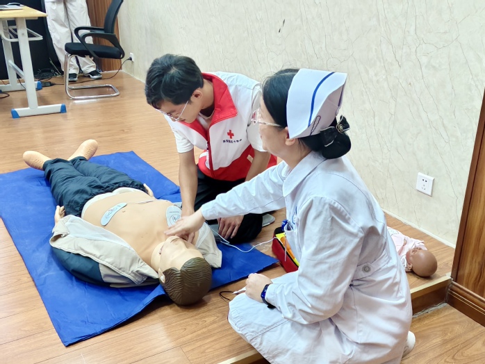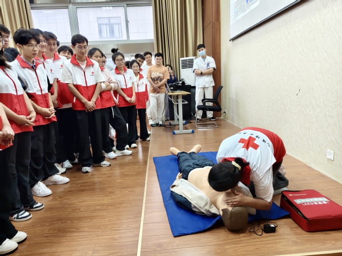 培训内容紧密围绕校园生活中可能遇到的紧急情况展开,重点讲解了心肺复苏(CPR)的操作流程、自动体外除颤器(AED)的使用方法、气道异物梗阻(海姆立克急救法)的应对措施。教学借助教学模拟人,一步步分解操作要领,强调“黄金救援4分钟”的重要性,语言通俗易懂,演练精准到位。