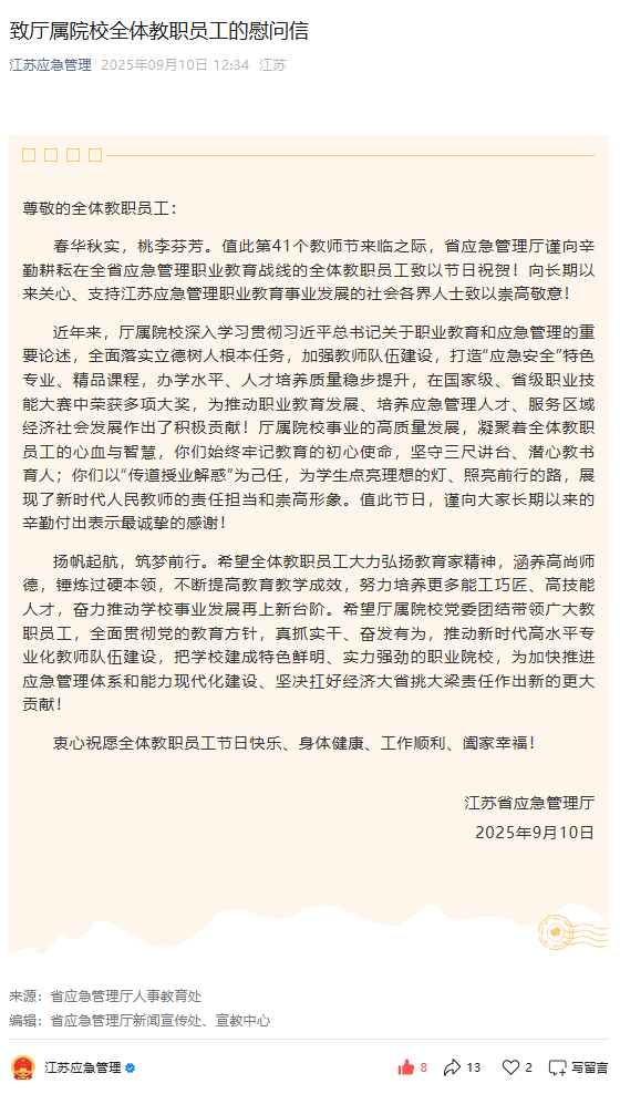省应急管理厅致厅属院校全体教职员工的慰问信