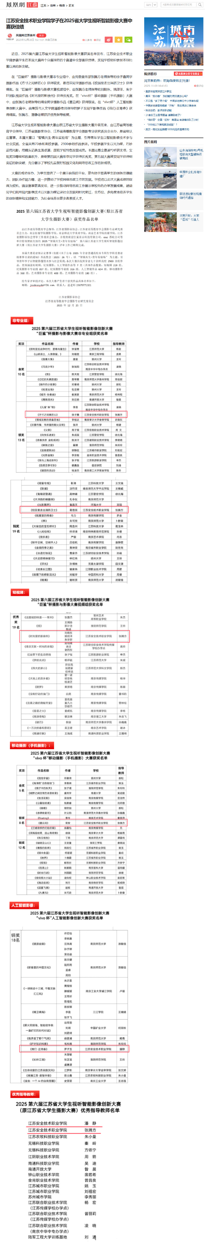 凤凰网江苏:江苏安全技术职业学院学子在2025省大学生视听智能影像大赛中喜获佳绩