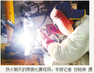 比赛要求将七块钢板和两个不同材质的圆管焊接成类似房子的形状。场地内,选手们全副武装:身着工作服、头戴安全帽,手套、口罩、面具、防护镜都是必须装备,选手们或弯着腰、或半蹲着、或单膝着地、或干脆全跪着,眼睛无一例外地直盯着机器,电、光、钢、铁的环境下,稍一懈怠就会危及安全。