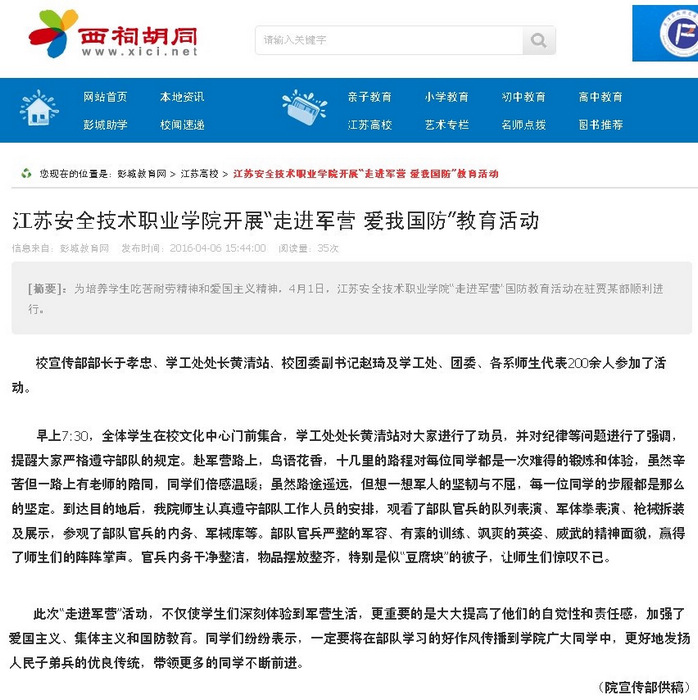 【西祠胡同】江苏安全技术职业学院开展“走进军营 爱我国防”教育活动