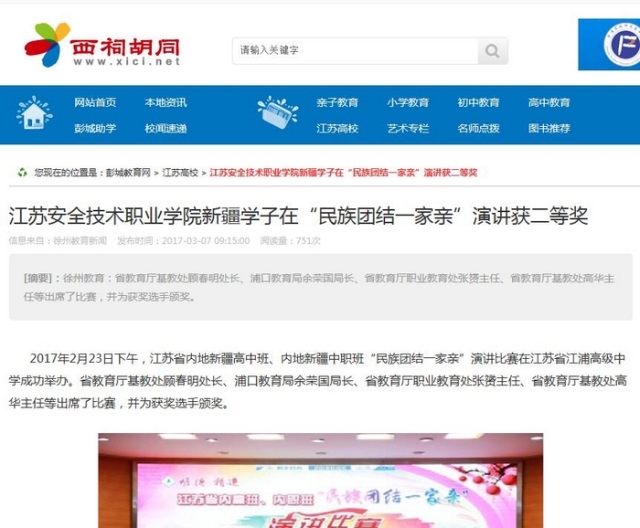 【西祠胡同】江苏安全技术职业学院新疆学子在“民族团结一家亲”演讲获二等奖