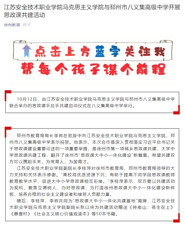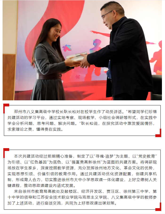 徐州教育:江苏安全技术职业学院马克思主义学院与邳州市八义集高级中学开展思政课共建活动