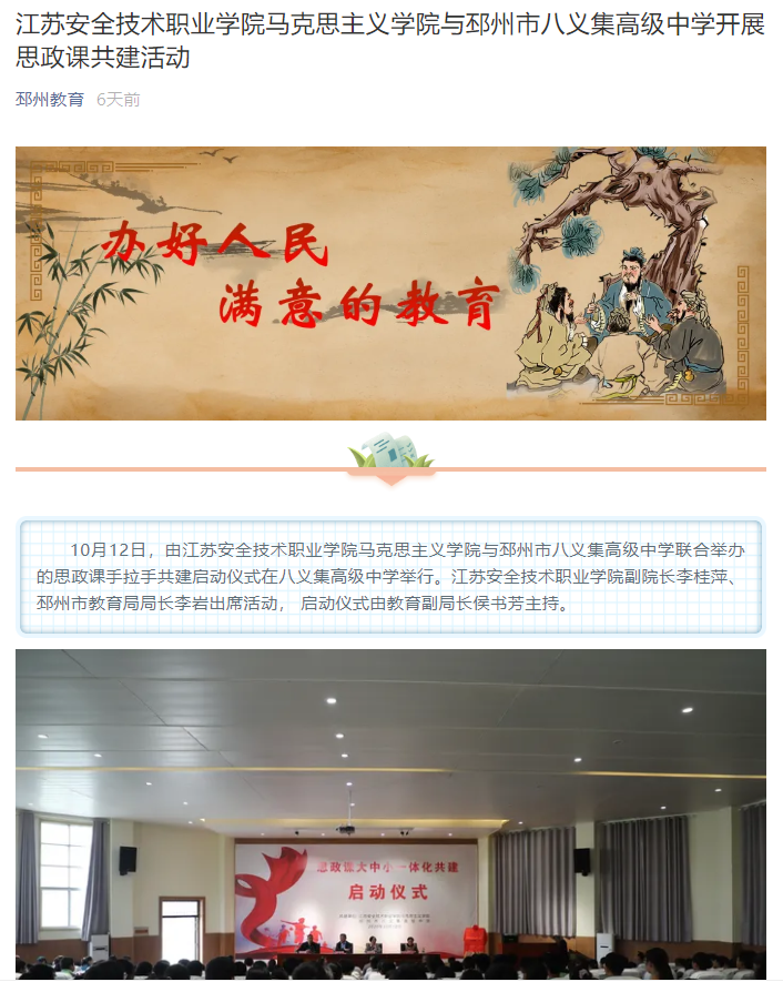 邳州教育:江苏安全技术职业学院马克思主义学院与邳州市八义集高级中学开展思政课共建活动