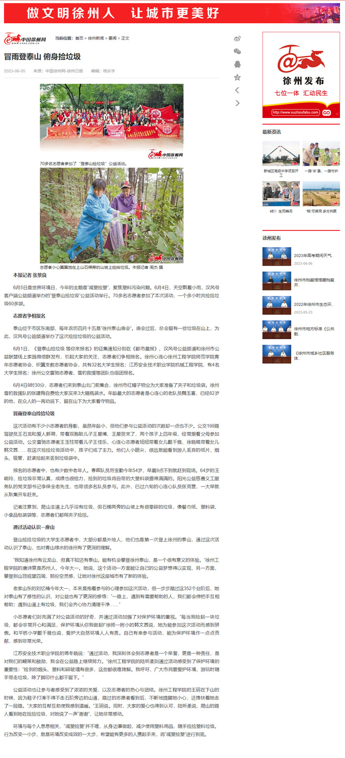 中国徐州网:冒雨登泰山 俯身捡垃圾