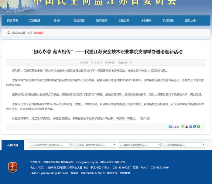 中国民主同盟江苏省委员会:“初心永挚 薪火相传”——民盟江苏安全技术职业学院支部举办送老迎新活动