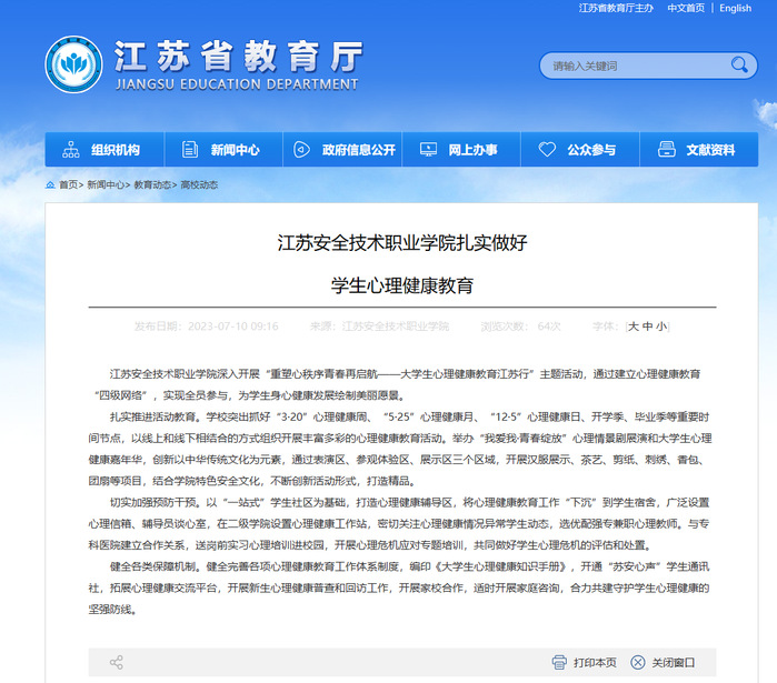 省教育厅:江苏安全技术职业学院扎实做好学生心理健康教育