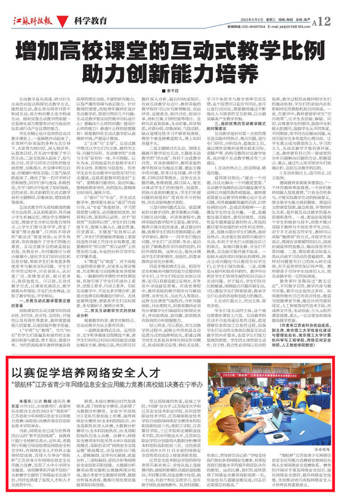 本报讯(记者陶韬通讯员宋东亚)9月3日,由省教育厅、省委网信办联合主办的2023年“领航杯”江苏省青少年网络信息安全应用能力竞赛(高校组)决赛在南京信息职业技术学院举办。