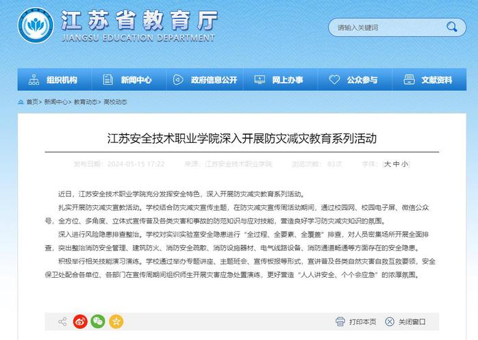 省教育厅:江苏安全技术职业学院深入开展防灾减灾教育系列活动