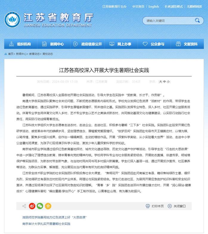 省教育厅:江苏各高校深入开展大学生暑期社会实践