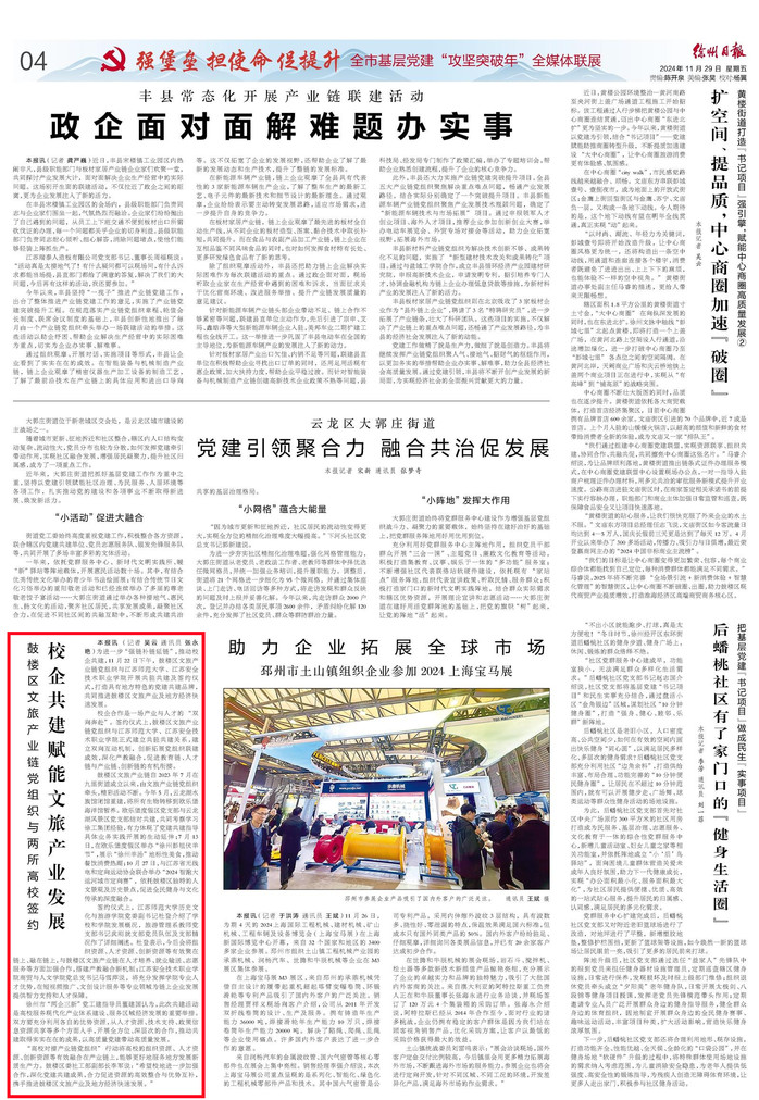 鼓楼区文旅产业链自2023年7月在九里街道成立以来,由文旅产业链党组织牵头,精彩活动不断。今年5月,云龙湖水族馆闭馆重建,将所有生物转移到欧乐堡海洋馆暂养。欧乐堡度假区党支部与云龙湖风景区党支部结对共建,共同考察学习徐工集团经验,有力体现了党建共建指导具体业务实践开展的生动延伸;7月13日,在欧乐堡度假区举办“徐州彭祖伏羊节”,展示“徐州羊汤”地标性美食,推动餐饮消费热潮;10月27日,与江苏省无线电和定向运动协会联合举办“2024智跑大运河城市定向赛”,依托鼓楼区独特的人文景观及历史景点,促进全民健身与文化传承的深度融合。