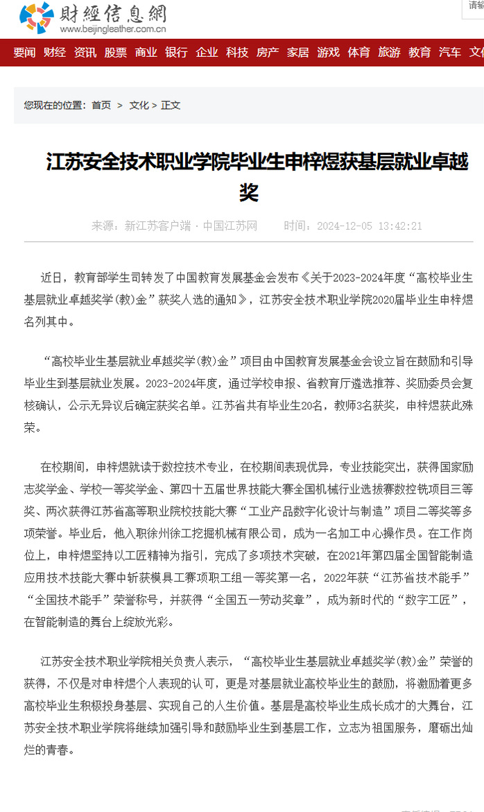 财经信息网:江苏安全技术职业学院毕业生申梓煜获基层就业卓越奖