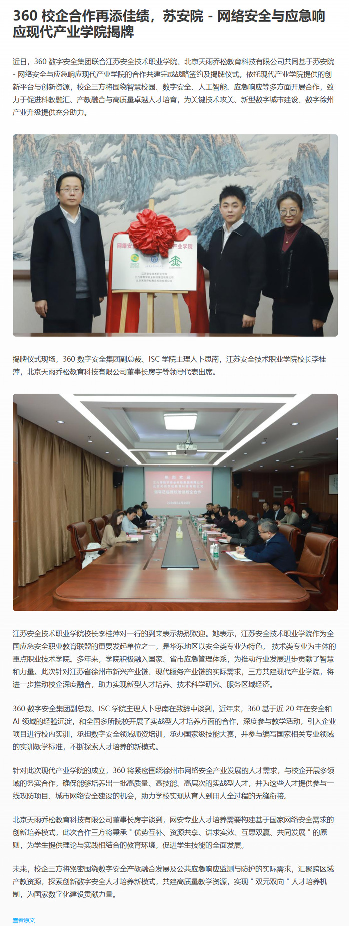ZAKER:360 校企合作再添佳绩,苏安院 - 网络安全与应急响应现代产业学院揭牌