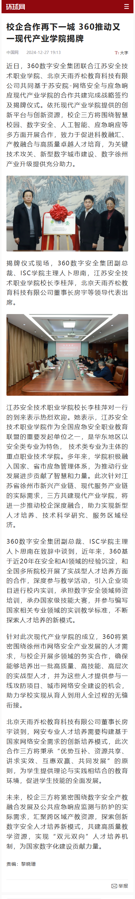 环球网:校企合作再下一城 360推动又一现代产业学院揭牌