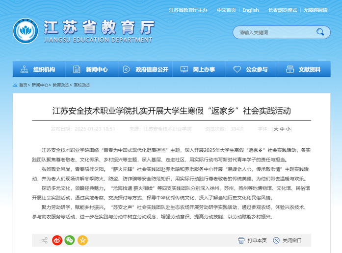 省教育厅:江苏安全技术职业学院扎实开展大学生寒假“返家乡”社会实践活动